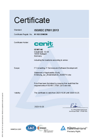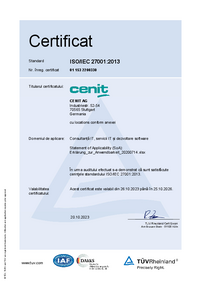 Cele două certificări ISO pe care le deținem sunt o dovadă a standardelor înalte pe care ni le-am stabilit. Acestea confirmă faptul că, în domeniile consultanței, serviciilor și dezvoltării de software IT, am introdus și aplicăm atât un sistem de management al calității, cât și un sistem de management al securității informațiilor. Un audit cuprinzător a confirmat faptul că aceste două sisteme îndeplinesc cerințele standardelor ISO.